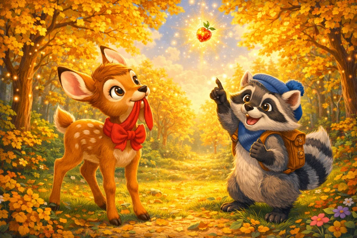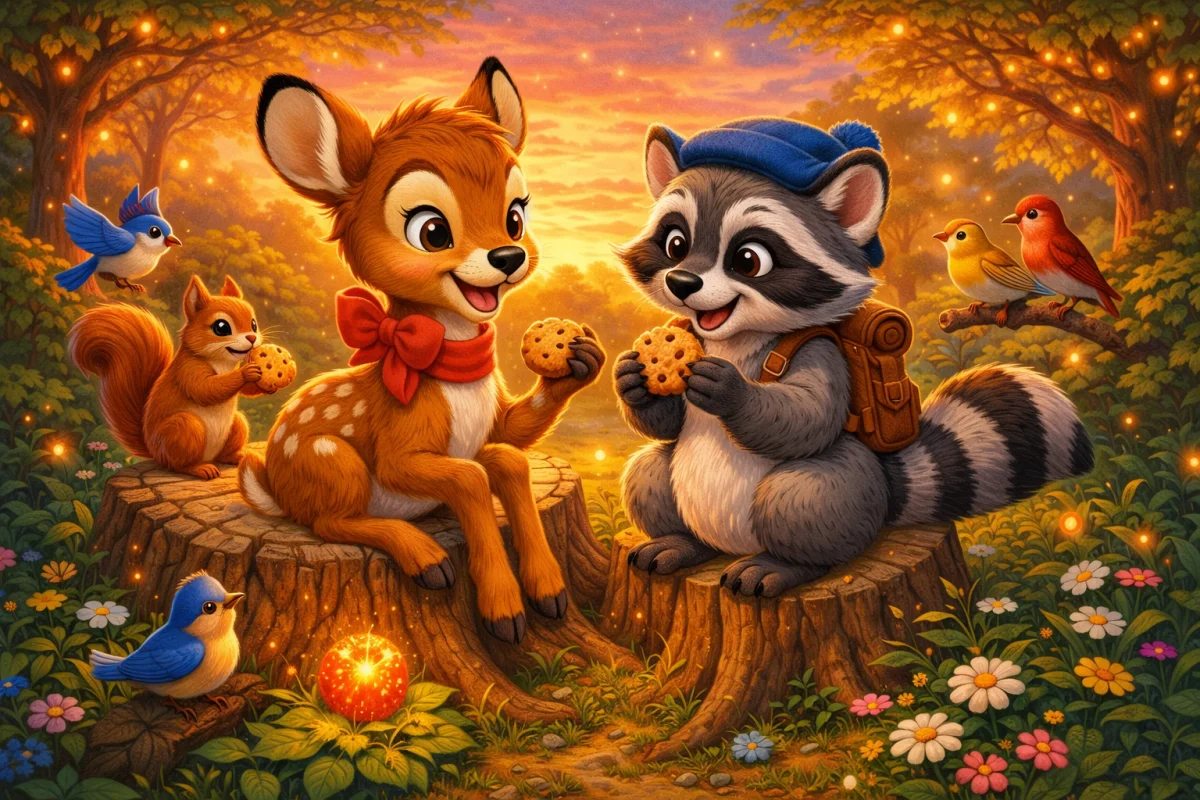 В далёком Волшебном лесу, где деревья шепчут сказки, а цветы светятся в темноте, жили два лучших друга — оленёнок Бэмби и енот Динь. Однажды утром Бэмби заметил, что на поляне исчезла волшебная ягода — та самая, что делает пение птиц ещё красивее. «Надо найти её!» — воскликнул Динь, надевая свою кепку и проверяя рюкзак. «А вдруг она упала в Сияющий ручей?» — предположил Бэмби, трепеща от волнения.