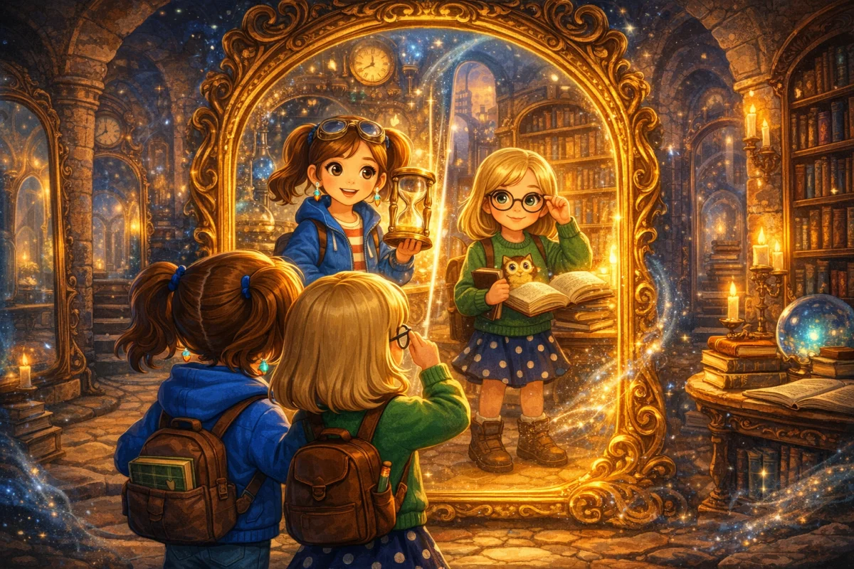 Внутри — огромное зеркало, в котором отражался не замок, а их будущее. Полина увидела себя в лаборатории, изучающей часы. Даша — в библиотеке, пишущей книгу о волшебных механизмах.