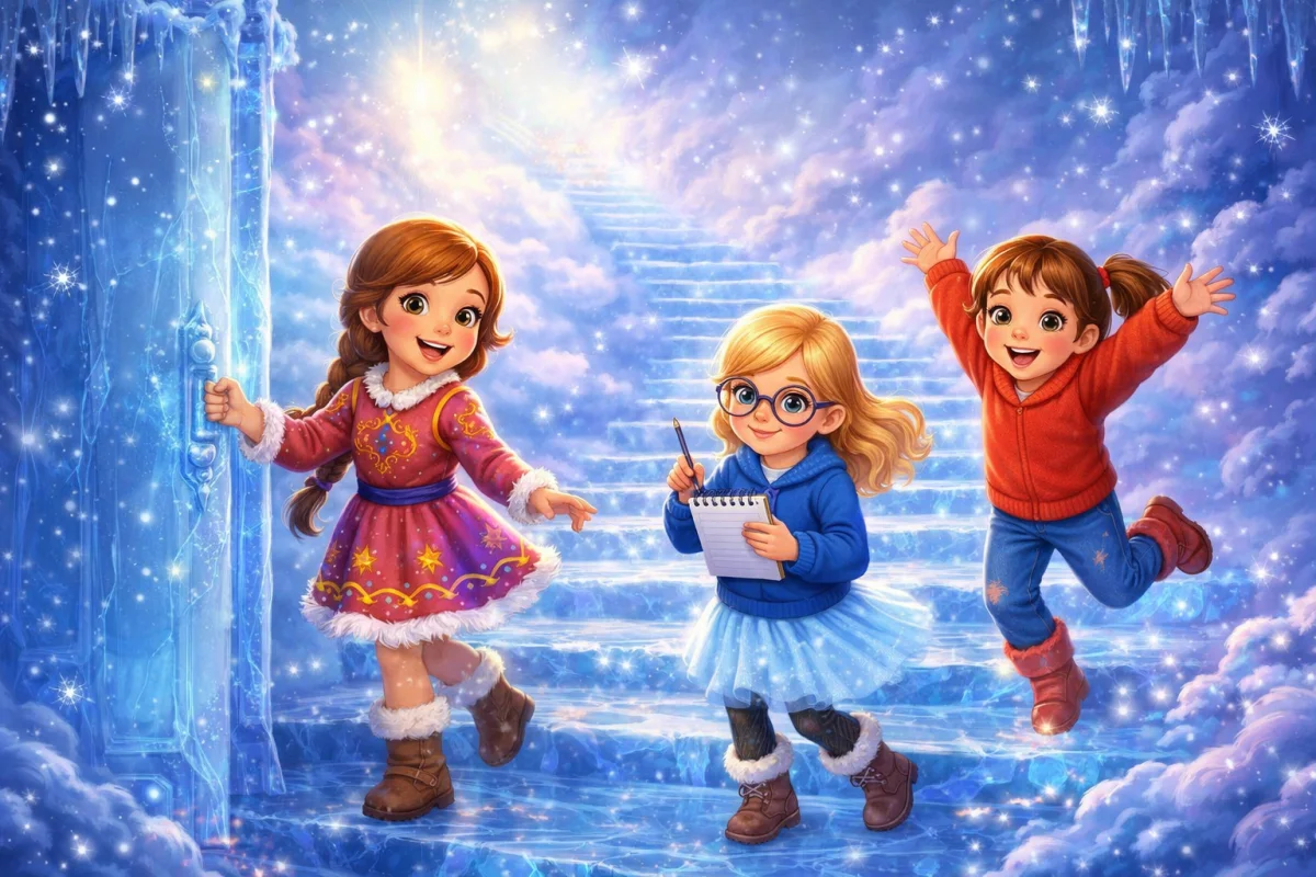 В далёкой-далёкой стране, за тремя горами, за семью лесами, за девятью реками, где зима не кончалась никогда, а снег падал не как обычно — медленно и тихо, а как будто танцевал в воздухе, — жила маленькая девочка по имени Полина. У неё были русые волосы, заплетённые в толстую косу, и платье с вышивкой в виде звёзд, потому что она мечтала стать волшебницей. Всё началось в тот день, когда Полина, Даша и Маша, её самые лучшие подруги, отправились на прогулку в лес за деревней. Даша, в своих круглых очках, несла блокнот — она всегда записывала всё интересное. Маша, в красном свитере, прыгала по сугробам, как заяц, и смеялась так громко, что птицы взлетали с веток.