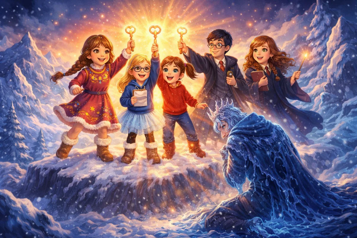 Гарри поднял палочку, Гермиона — тоже. Девочки встали рядом с ними, и в этот момент из их сердец вырвался свет — тёплый, яркий, волшебный. Ледяной Король закричал от боли, его мантия начала таять, а корона — рассыпаться. Он упал на колени, и третий ключ выскользнул из его рук.