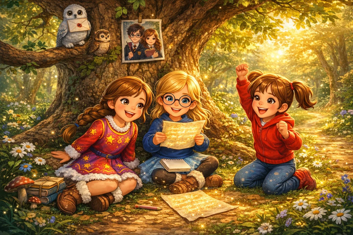 С тех пор они стали ещё ближе. Иногда они возвращались к дубу, чтобы проверить, не появилась ли снова ледяная дверца. А однажды, когда они сидели под деревом, на земле появился листок бумаги — письмо от Гарри и Гермионы: