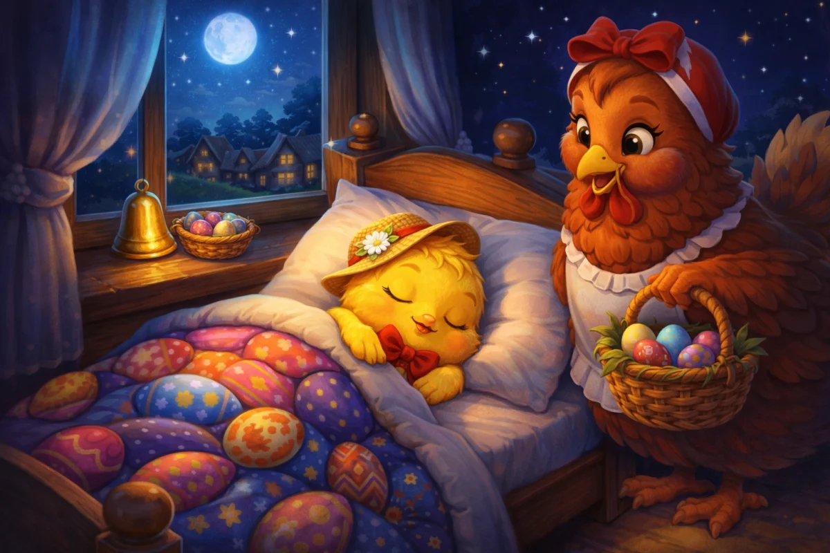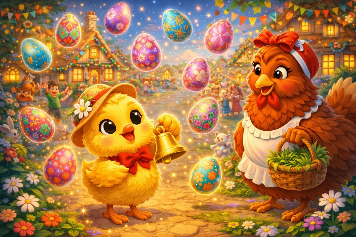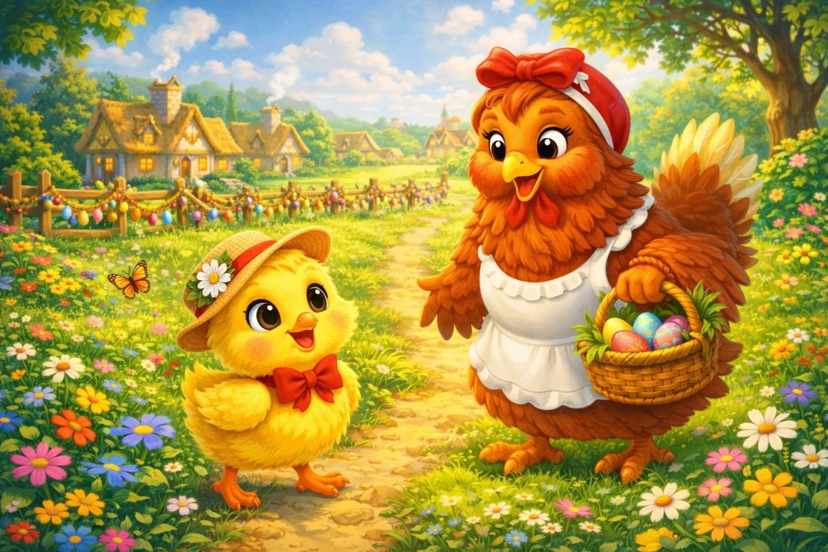 В уютной деревне, где пахло свежим хлебом и цветущими садами, жила маленькая семья курочек. Главной заботой Мамы курочки было ухаживать за её единственным цыплёнком — Цыпиком. Цыпик был необычным: он любил задавать вопросы, искать приключения и верить в чудеса. Особенно в Пасху — день, когда деревня оживала яркими красками, а в каждом доме пахло пасхальными куличами и ароматом цветов.